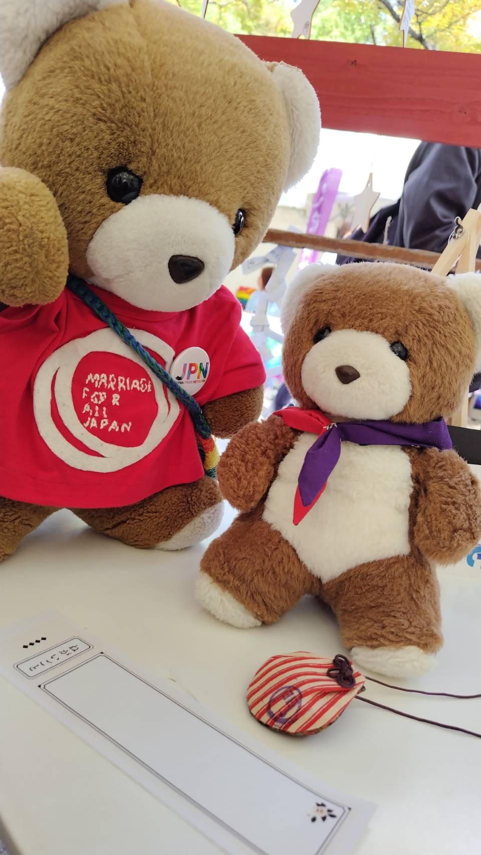 写真左。「結婚の自由をすべての人に」訴訟やマリフォーを勝手に応援しているくまちゃん。